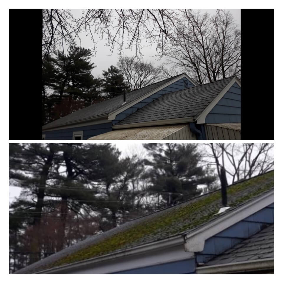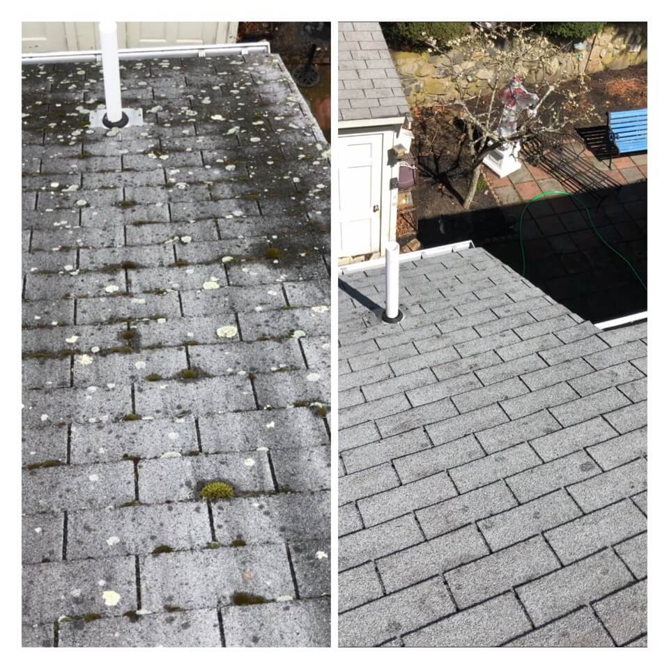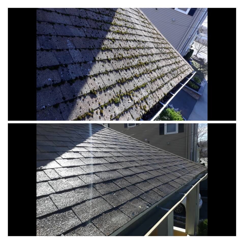HiCleaners is the most experienced company in Sherborn, MA that deals with roof washing and roof soft washing. All of our employees are trained to recognize precise solution mixing ratios to provide you with the safest and most effective soft washing service. Roofs are a commonly neglected part of a house due to the fact that most people don’t have ladders to access it, so it is very easy to just leave it alone and forget about problems that may start to arise. Just like many home owners, discoloration and small bits of moss on a roof can be overlooked because of the misconception that it is just aesthetic. However, it isn’t just aesthetic, the moss slowly lifts the granules off the shingles which in turn shorten the life of the shingle. The moss also spreads, just like any bacteria if it is left alone for too long, it can quickly become a problem that spirals out of control. Call HiCleaners for a free quote, we only use the most advanced eco-friendly solutions and equipment to make sure the job is done right, for the safety of the employees, your plants, grass, pets, and children.