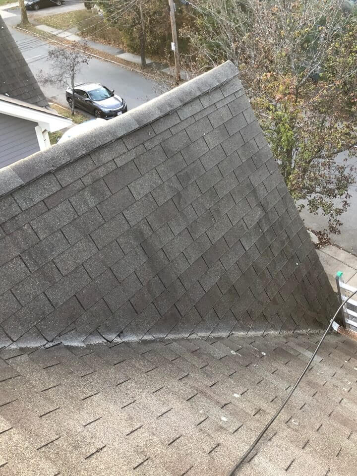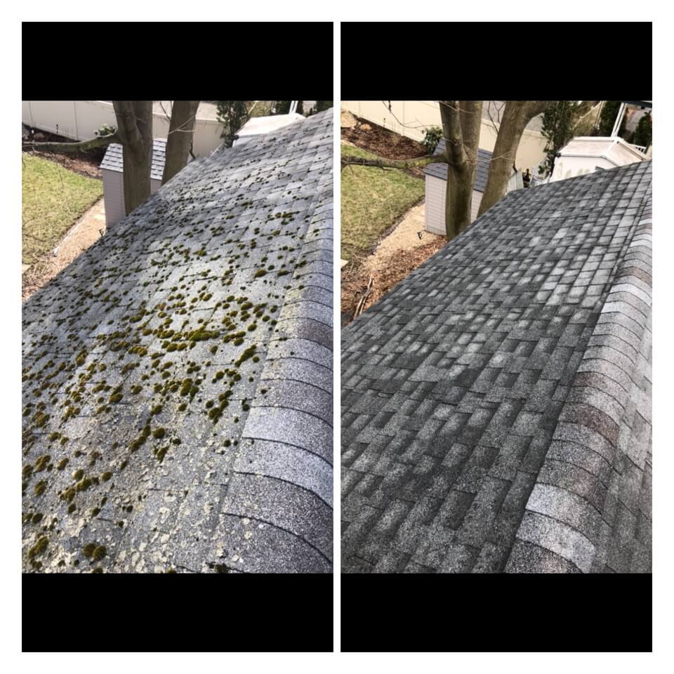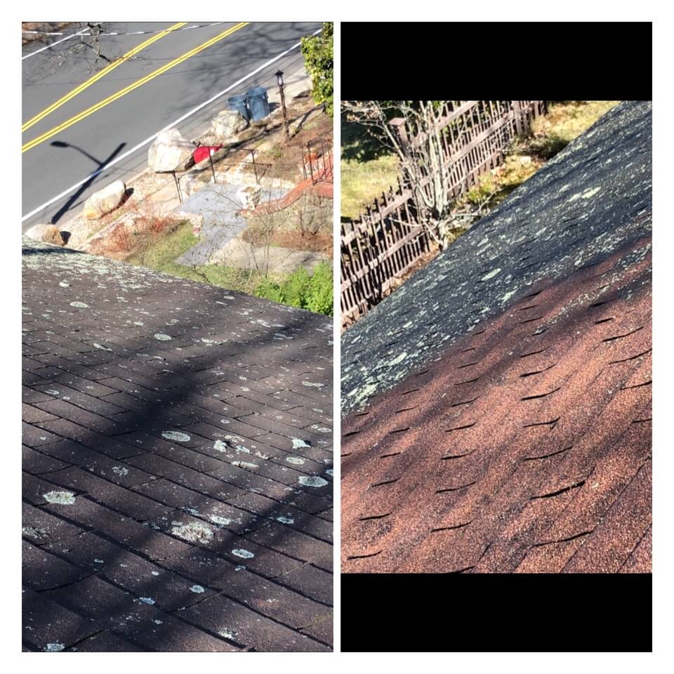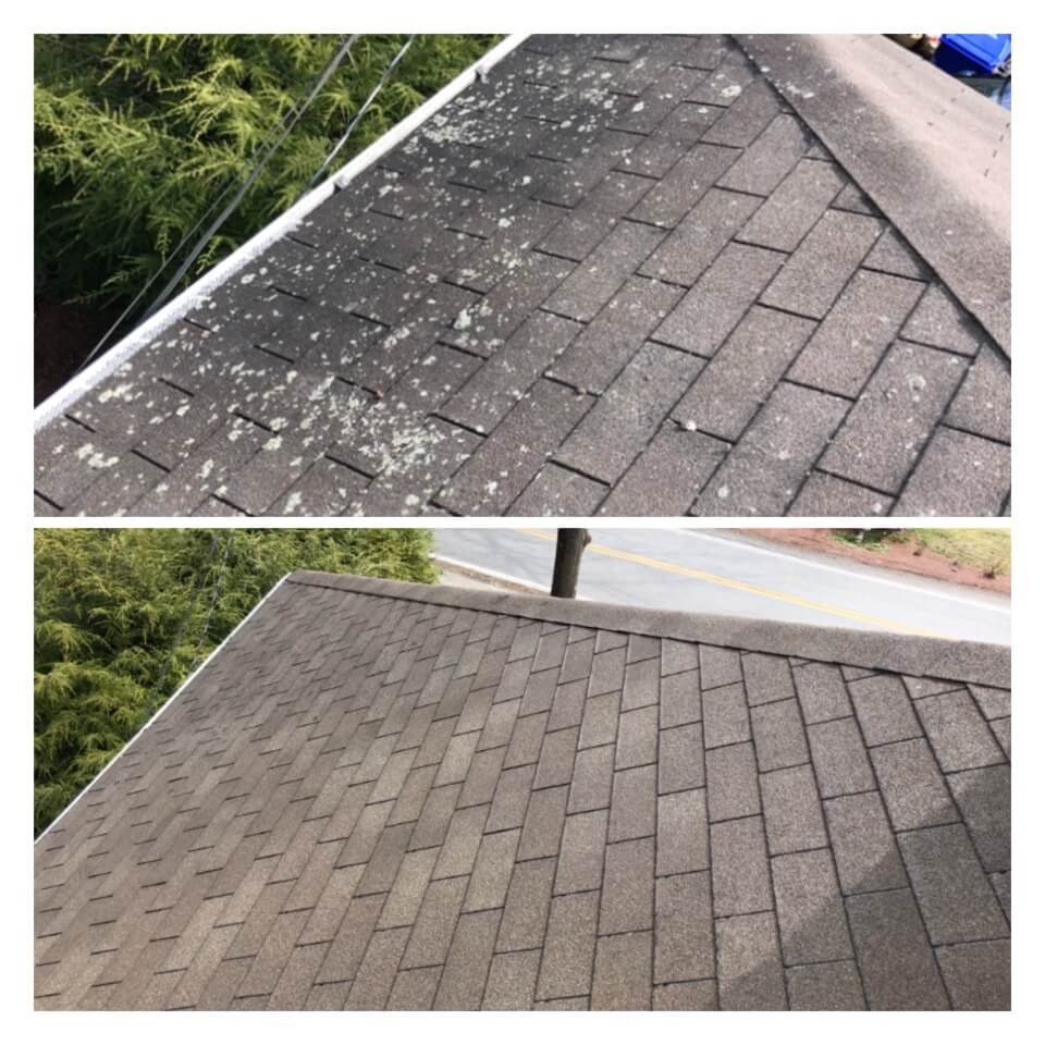HiCleaners is the most experienced company in Sherborn, MA that deals with roof washing and roof soft washing. All of our employees are trained to recognize precise solution mixing ratios to provide you with the safest and most effective soft washing service. Roofs are a commonly neglected part of a house due to the fact that most people don’t have ladders to access it, so it is very easy to just leave it alone and forget about problems that may start to arise. Just like many home owners, discoloration and small bits of moss on a roof can be overlooked because of the misconception that it is just aesthetic. However, it isn’t just aesthetic, the moss slowly lifts the granules off the shingles which in turn shorten the life of the shingle. The moss also spreads, just like any bacteria if it is left alone for too long, it can quickly become a problem that spirals out of control. Call HiCleaners for a free quote, we only use the most advanced eco-friendly solutions and equipment to make sure the job is done right, for the safety of the employees, your plants, grass, pets, and children.